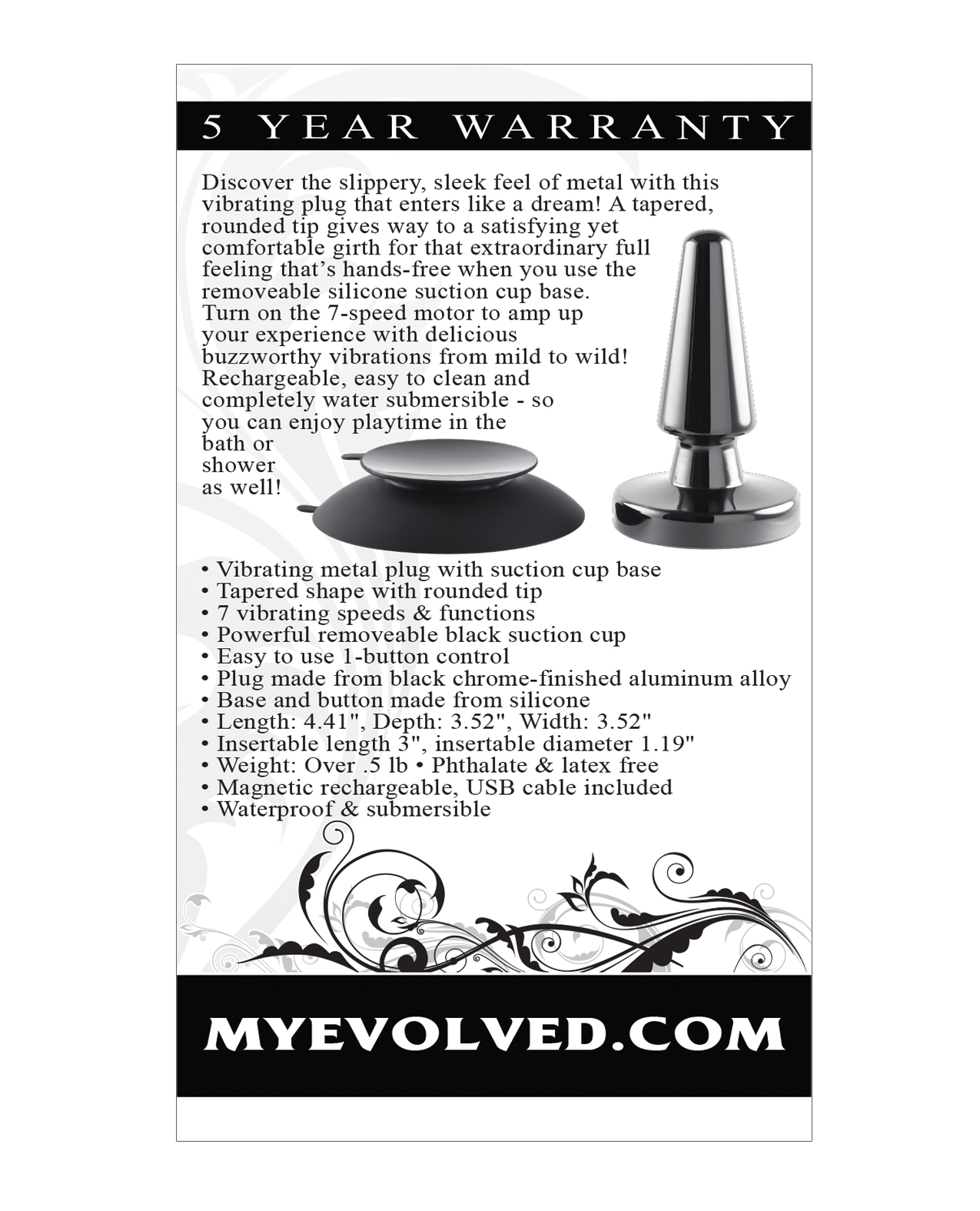 Discover the slippery, sleek feel of metal with this vibrating plug that enters like a dream! A tapered, rounded tip gives way to a satisfying yet comfortable girth for that extraordinary full feeling that’s hands-free when you use the 2-sided silicone suction cup base. Turn on the 7-speed motor to amp up your experience with delicious buzzworthy vibrations from mild to wild! Rechargeable, easy to clean and completely water submersible – so you can enjoy playtime in the bath or shower as well!
