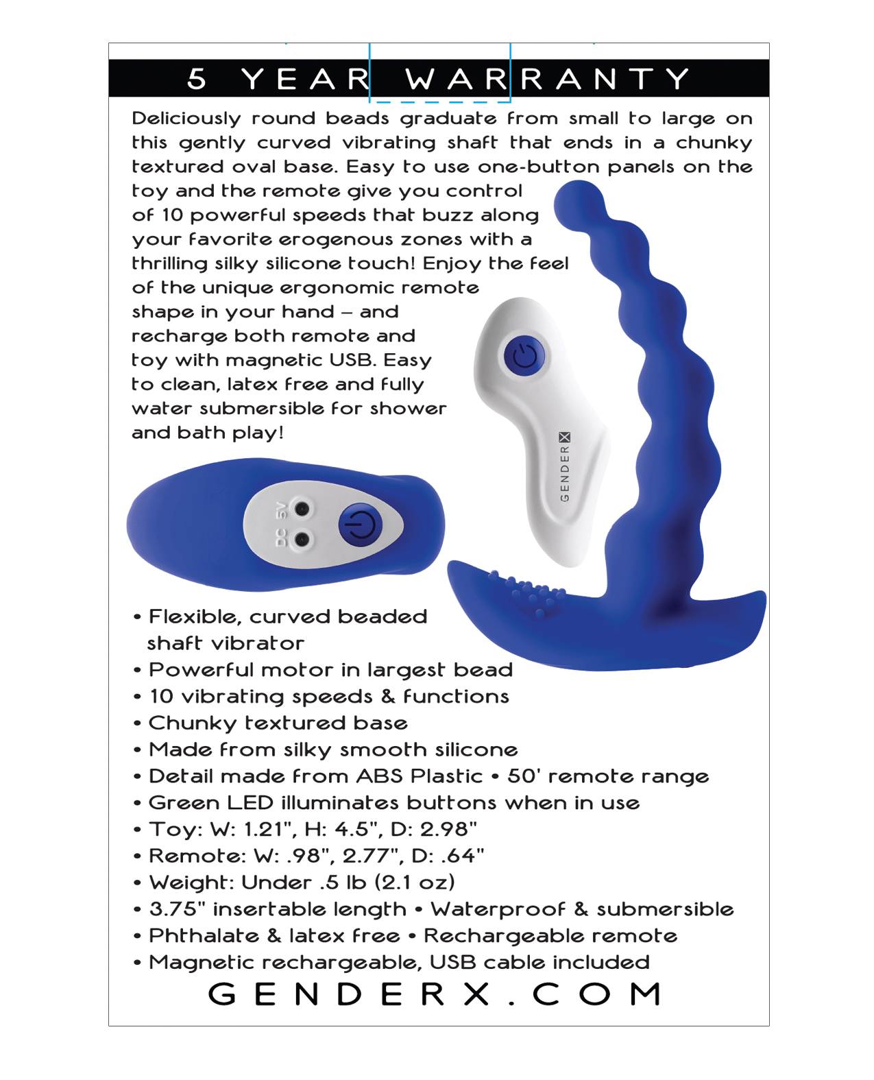 Deliciously round beads graduate from small to large on this gently curved vibrating shaft that ends in a chunky textured oval base. Easy to use one-button panels on the toy and the remote give you control of 10 powerful speeds that buzz along your favorite erogenous zones with a thrilling silky silicone touch! Enjoy the feel of the unique ergonomic remote shape in your hand – and recharge both remote and toy with magnetic USB. Easy to clean, latex free and fully water submersible for shower and bath play!