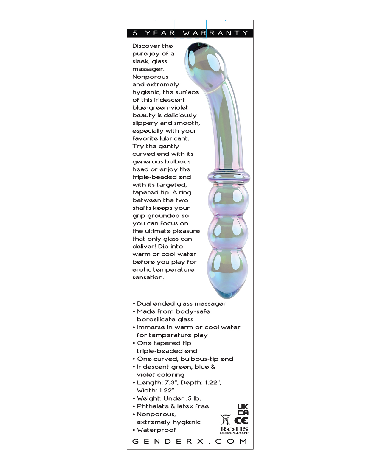 Discover the pure joy of a sleek, glass massager. Nonporous and extremely hygienic, the surface of this iridescent blue-green-violet beauty is deliciously slippery and smooth, especially with your favorite lubricant. Try the gently curved end with its generous bulbous head or enjoy the triple-beaded end with its targeted, tapered tip. A ring between the two shafts keeps your grip grounded so you can focus on the ultimate pleasure that only glass can deliver! Dip into warm or cool water before you play for erotic temperature sensation. Five Year Warranty.