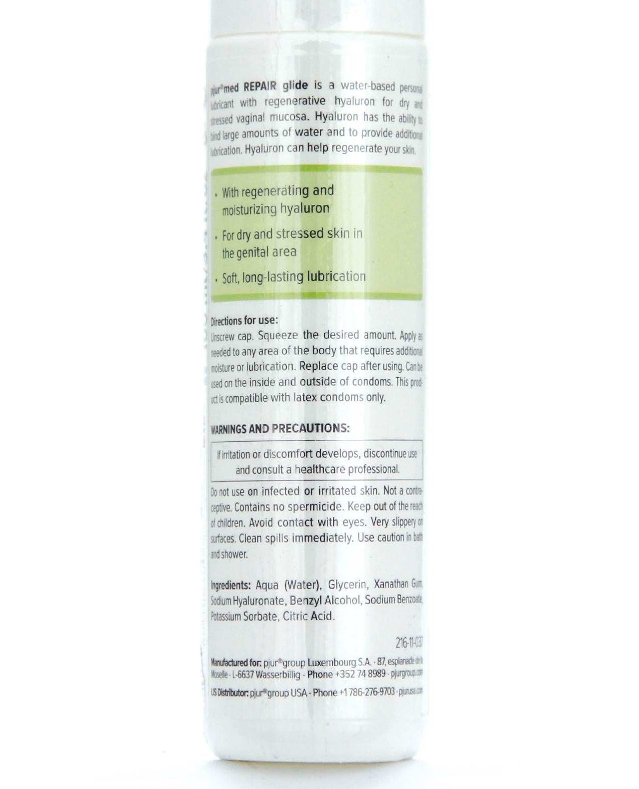 Repair Glide is a very gentle water-based double-effect personal lubricant with key ingredient moiturizing hyaluronan and nature-based presevatives to enhance natural lubrication of sensitive skin. This health-conscious personal lubricant is hypoallergenic, latex condom safe, and ideal for daily use. Medical grade ingredients and unique formula make it a natural choice for a moisturizing, water-based personal lubricant.Modern lifestyle products:- a more health-conscious choice- premium personal care- gentle and effective. From Pjur.