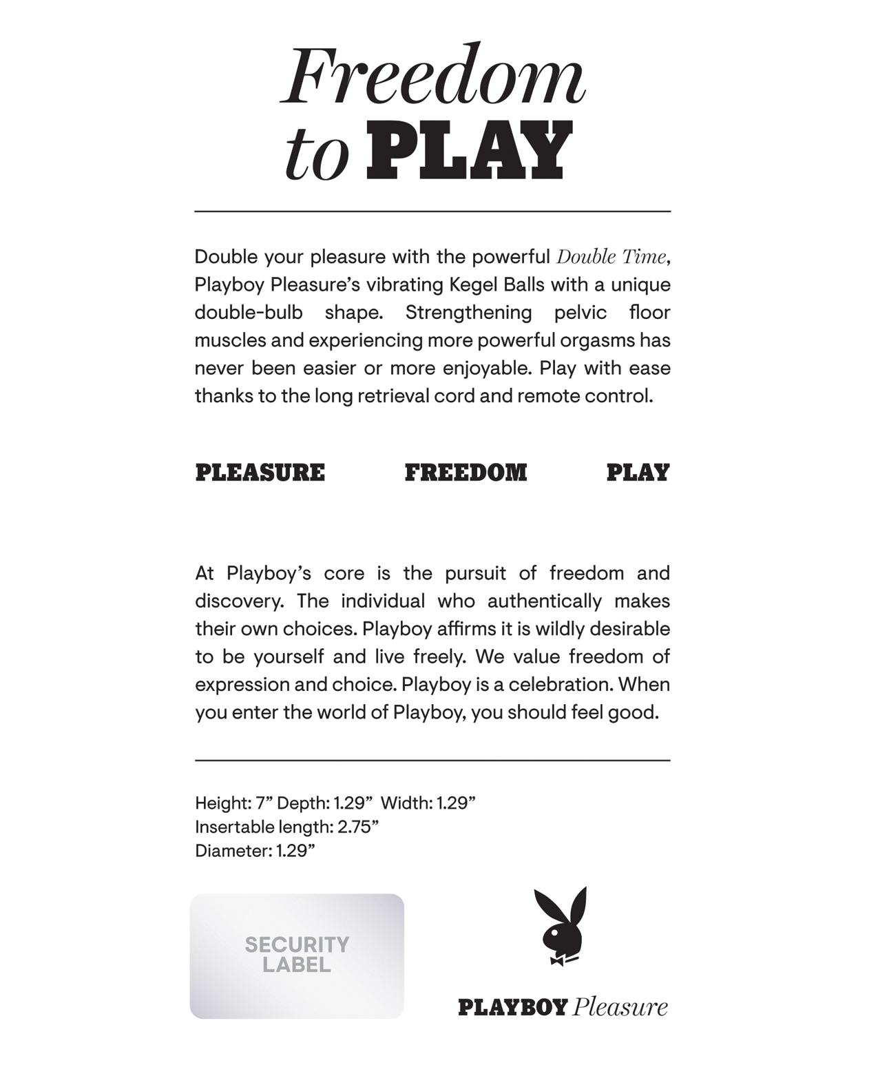 Double your pleasure with the powerful Double Time, Playboy Pleasure’s vibrating Kegel Balls with a unique double-bulb shape. Strengthening pelvic floor muscles and experiencing more powerful orgasms has never been easier or more enjoyable. Play with ease thanks to the long retrieval cord and remote control.