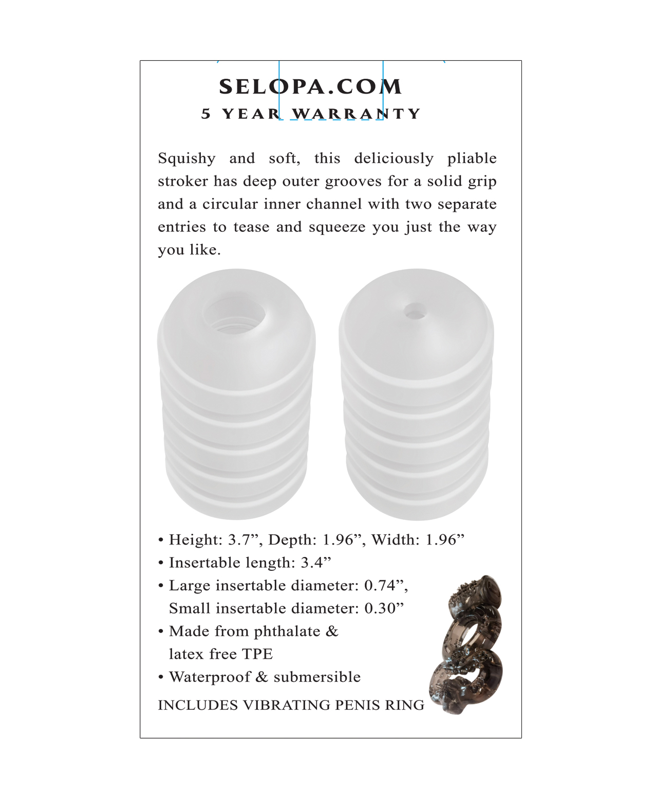 Squishy and soft, this deliciously pliable stroker has deep outer grooves for a solid grip and a circular inner channel with two separate entries to tease and squeeze you just the way you like.