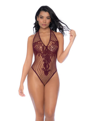 Floral Convertible Top Fishnet Bodysuit - Burgundy O/S