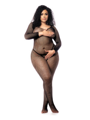 Long Sleeved All Over Fishnet Body Stocking Black QN