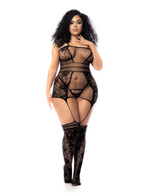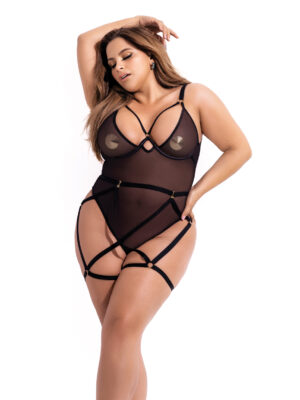 Underwire Mesh Bodysuit w/Garterbelt Black 1X/2X
