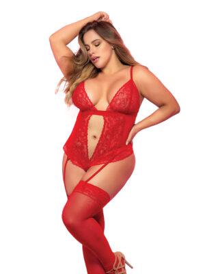 Lace & Mesh Teddy w/Hook & Eye Crotch Closure w/Attached Garter Straps Red 2X/3X